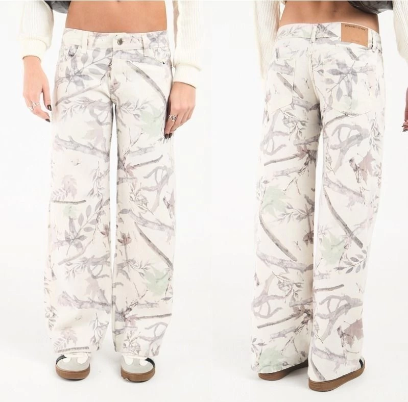 Jean rígido wide leg color claro con estampa de flores y hojas. Talles del 34 al 44.