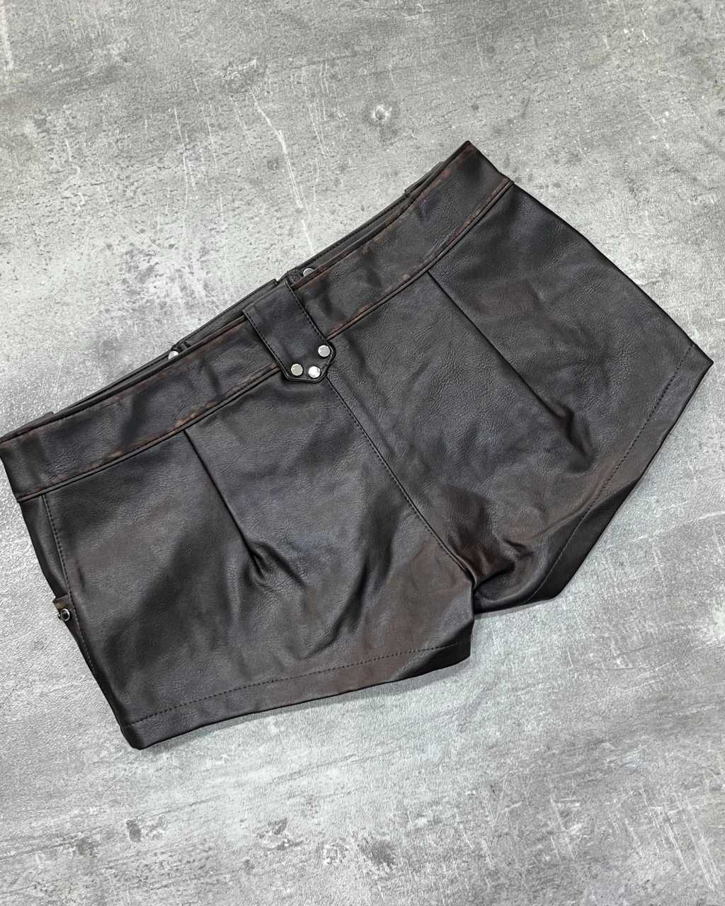 Short engomado tiro bajo con apliques plateados, trenzado adelante y con pasacintos. Talles S/M y M/L.